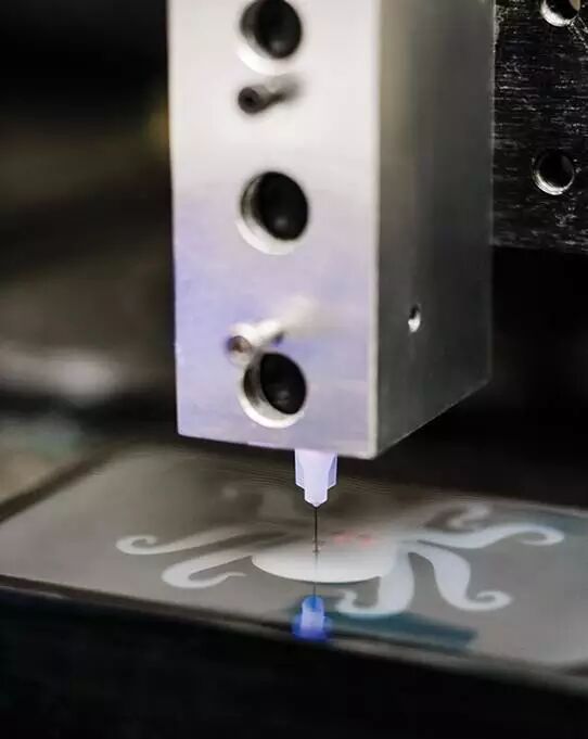接下來,用3D印表機將墨水線擠入矽樹脂體中。鉑墨可以把液體過氧化氫變成氣體,用來移動觸手;另一種墨水之後會蒸發掉,形成整個機器人體內的氣體通道。