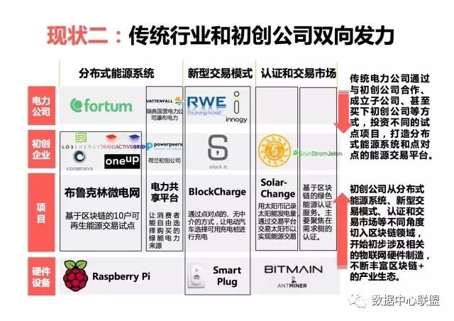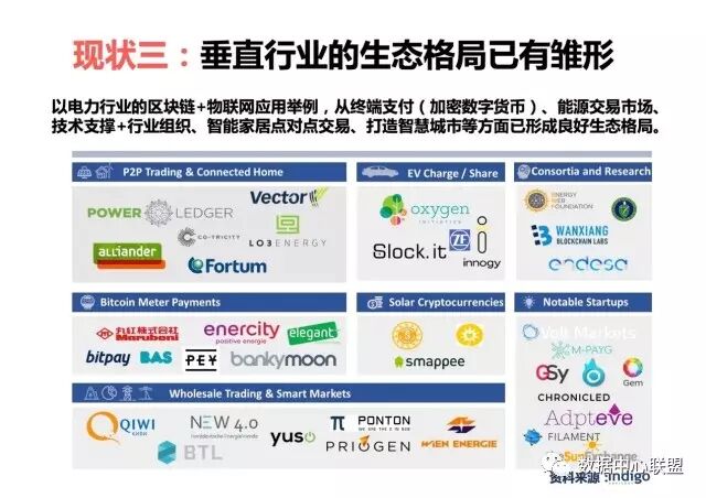 產業現狀三是,垂直行業的生態格局已初步具有雛形。根據諮詢公司Indigo的報告,還是以電力行業的區塊鏈+物聯網應用舉例,從終端支付(加密數字貨幣)、能源交易市場、技術支撐+行業組織、智能家居點對點交易、打造智慧城市等方面已形成良好生態格局。對於我們國家而言,萬向要在浙江打造基於區塊鏈的、聚合能源、電動車、物聯網、金融科技的聚能城,量子鏈也即將推出物聯網的區塊鏈專案等。