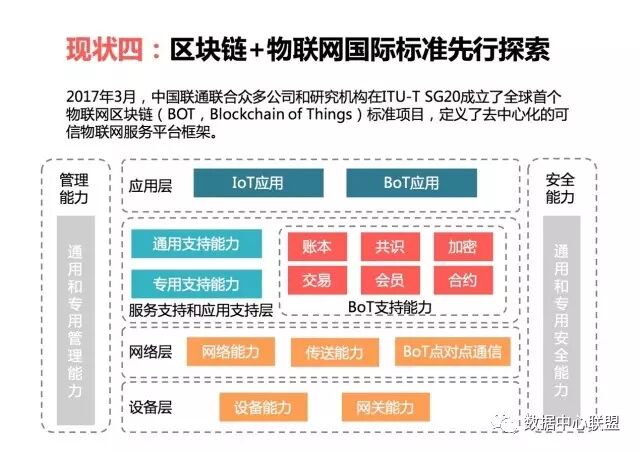 產業現狀四是,區塊鏈+物聯網的國際標準先行探索。2017年3月,中國聯通聯合眾多公司和研究機構在ITU-T SG20成立了全球首個物聯網區塊鏈(BOT,Blockchain of Things)標準專案,定義了去中心化的可信物聯網服務平臺框架。我院在ITU-T的SG 16工作組也完成了區塊鏈的相關立項。