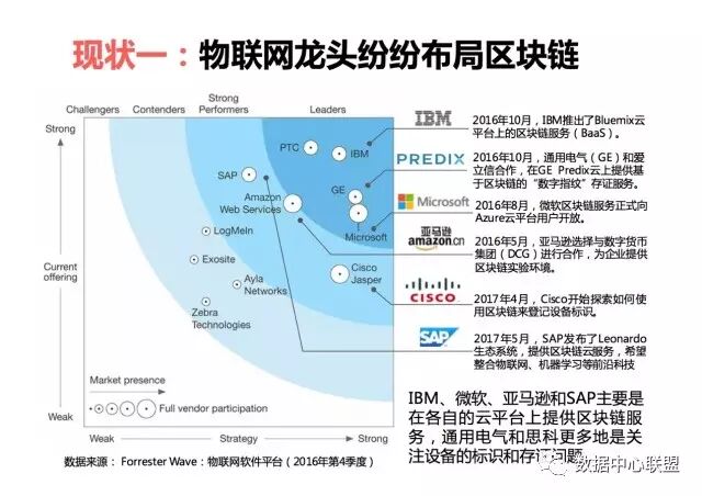 產業現狀一:物聯網龍頭紛紛開始佈局區塊鏈。根據Forrester Wave:物聯網軟體平臺(2016年第4季度)的報告顯示, IBM、PTC、GE和微軟已成為佔據物聯網平臺市場的主導企業。SAP、AWS、Cisco、LogMeln、Exosite、Ayla Networks和Zebra Technologies名列前11名。對於排名靠前的物聯網平臺龍頭企業,除了美國參數技術公司(PTC)沒有實質披露區塊鏈相關專案以外(該公司很多區塊鏈相關的文章),IBM、微軟、亞馬遜和SAP都在各自的雲平臺上提供區塊鏈服務(Blockchain-as-a-Service),為未來海量的物聯網設備接入提供彈性資源池,做了超前佈局。通用電氣GE和思科更多地是關注設備的標識和存證問題。