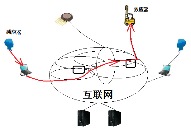 第一種是網路感測器到聯網智能設備的反射弧:例如,在大樓裏,溫度感測器檢測到室內溫度升高超過100度,同時氣敏感測器檢測到室內二氧化碳濃度升高,於是報警資訊通過互聯網線路傳送到伺服器中心,伺服器發送指令給大樓滅火機器人,由該樓層滅火機器人操控水槍進行滅火。