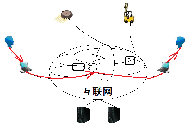 第二種是人到聯網智能設備的反射弧:例如,在大樓裏,大樓監控機房的值班人員發現某辦公室出現火苗和煙霧,於是按下報警按鈕,將報警資訊通過互聯網線路傳送到伺服器中心,伺服器發送指令給大樓滅火機器人,由該樓層滅火機器人操控水槍進行滅火。
