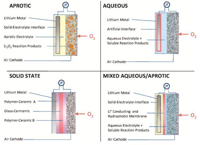 △ 圖5:四種類型鋰-空氣電池結構示意圖。(圖片來源:[9])