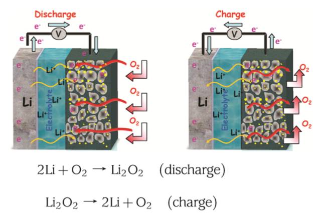 鋰-空氣電池以金屬鋰為負極,由碳基材料組成的多孔電極為正極。放電過程中,金屬鋰在負極失去電子成為鋰離子,電子通過外電路到達多孔正極,將空氣中的氧氣還原,而鋰離子穿過電解質到達多孔正極,與氧氣和電子形成過氧化鋰(Li₂O₂)(主要產物)。這一反應持續進行,電池便可以向負載提供能量。充電過程正好相反,在充電電壓的作用下,放電過程中產生的放電產物首先在多孔正極被氧化,重新放出氧氣,鋰離子則在負極被還原成金屬鋰。