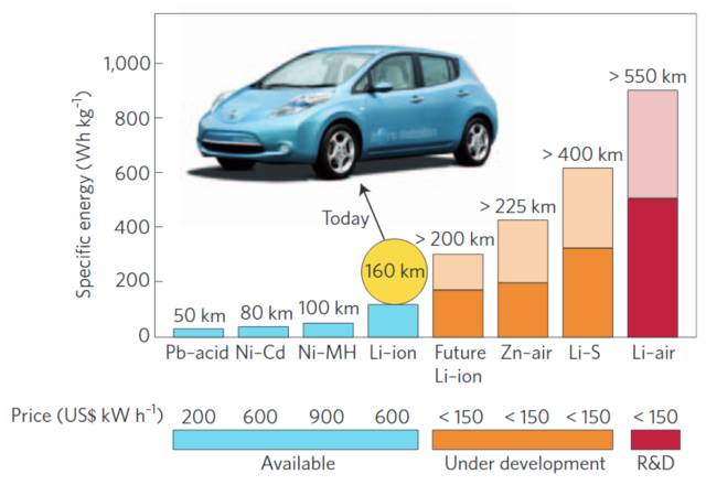 然而方法總比問題多,為了進一步提高可充電池的能量密度,減輕電池重量就成了一個突破口。雖然暫時無法找到比金屬鋰具有更高能量品質比的材料,但我們可以給電池整體來一個減重瘦身,進而提高電池整體的能量密度。其中最具代表性的就是鋰-空氣電池了。鋰-空氣電池的理論計算能量密度可以達到12000Wh/Kg,這足以媲美汽油的超高能量密度,使其有望完全替代汽油,真正實現超長旅程的純電動汽車[9, 10](圖3)。