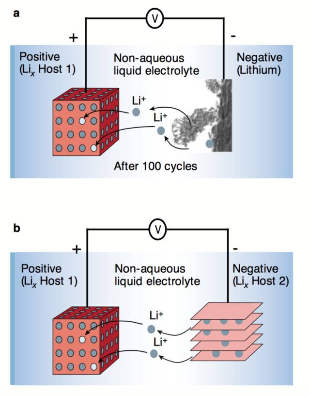△ 圖2:鋰電池的工作原理圖:a. 鋰金屬電池;b. 鋰離子電池。層狀結構可以有序的存儲鋰離子,防止枝晶的形成。(圖片來源:[7])