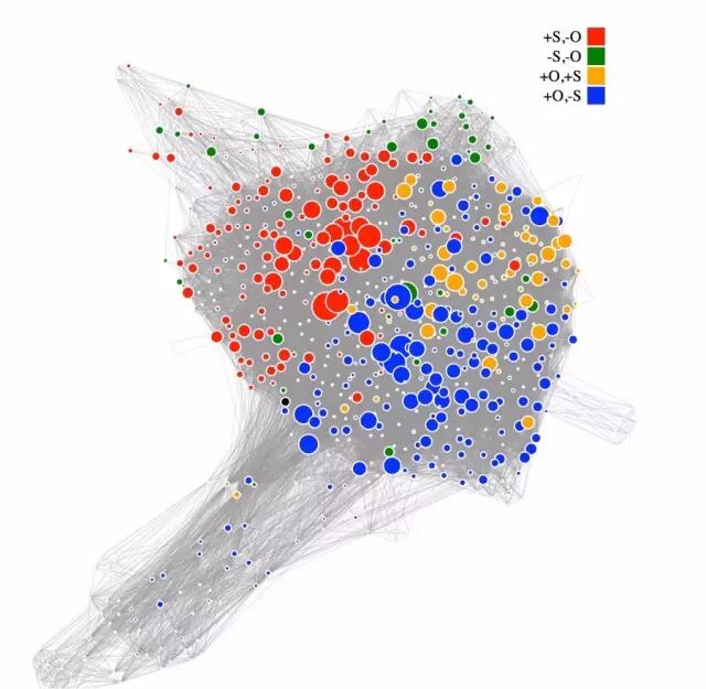 含403種碳礦物的網路圖顯示了其多樣性和分佈中隱藏的模式。每個彩色圓圈代表不同的碳礦物。圓圈的大小和顏色代表礦物的常見和罕見程度。黑色圓圈代表這些發現這些礦物發現的300多個地區。圓圈的大小表示在每個地方發現了多少含碳礦物,線條連接了礦物種類和地點。 礦物和地點的分佈遵循一種獨特的模式,有一些常見礦物但更多的是稀有礦物,這種分佈可以預測出地球上有超過1500種尚未被發現的礦物。