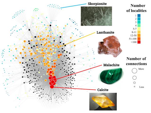 在《美國礦物學家》上發表的一篇論文中,作者展示了網路理論礦物學的第一個應用——網路分析技術。它使得地質學家能夠從一張圖表中囊括多個變數的數據,這些數據包括從成千上萬個地點採集的數千個礦物的資訊。可視化的圖像能夠顯示出傳統表格中隱藏的礦物分佈模式。換句話說,大數據提供了哪些礦物彼此共存的詳細特徵,以及它們的出現所需要的地質、物理、化學和生物學特徵。