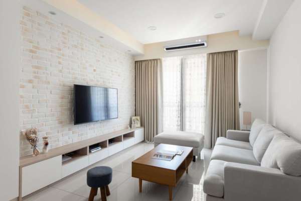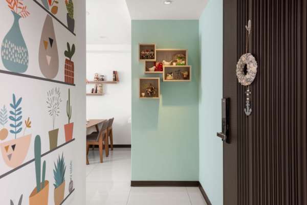 大家一進玄關,就看到北歐風的可愛插畫牆,延伸淺色的舒適牆面,搭配木色裝飾櫃、真的很有小玟的風格。小玟說當初也是看到很多桃園裝潢推薦評價很不錯,加上很喜歡這家居家空間設計的實績作品,於是就決定交給傢棻設計,當中設計師細心溝通、專業建議,實現小玟心中質感居家空間,尤其是客廳的電視牆,當初設計師建議使用淺暖色系的文化石,使這面電視牆更傢增添客廳的溫度質感,搭配淺木色氣的系統櫃,讓每日下班後的小玟可以很放鬆,假日更可以來個悠閒下午茶。