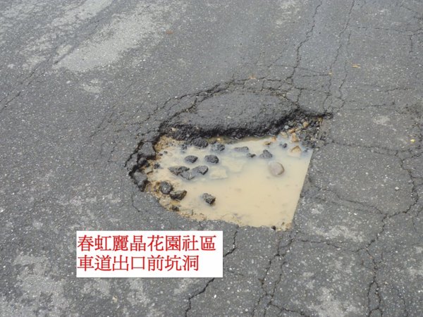 本(22)日中午民眾反映大昌路多處坑洞(如圖),尤其是春虹麗晶花園社區車道出口前的坑洞既大且深,嚴重影響行車安全,服務處主任已請工務課瞭解並儘速將坑洞填平,以免造成憾事。
