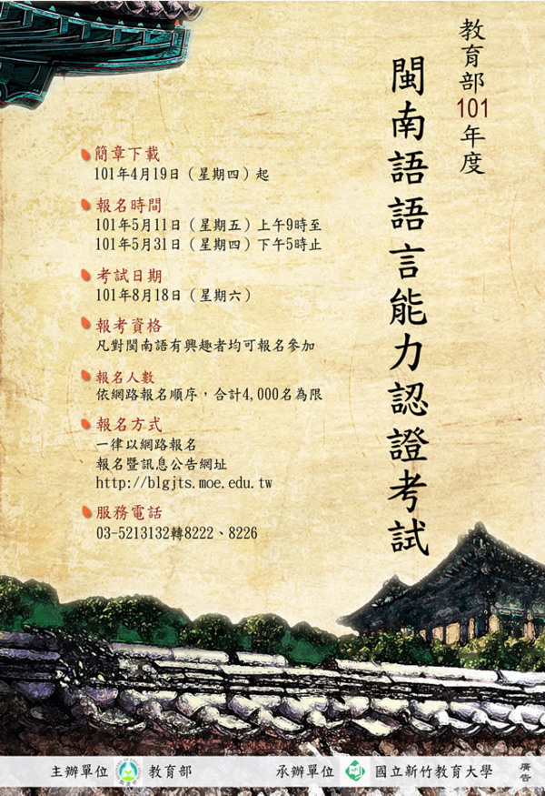教育部101年度閩南語語言能力認證考試於101年8月18日(星期六)舉辦
