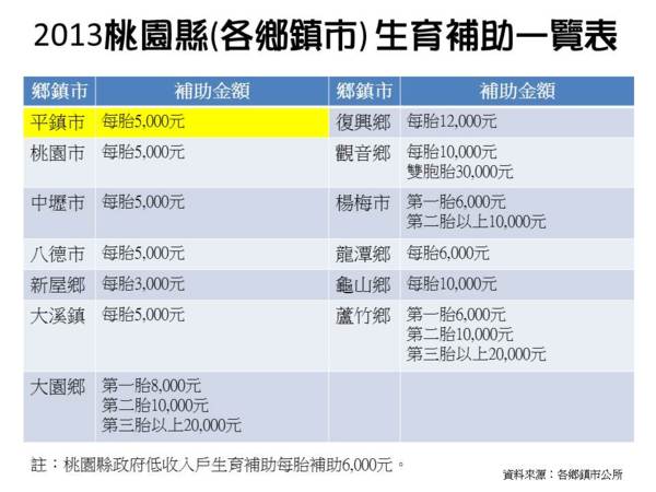 農幀比較桃園縣各鄉、鎮、市生育補助後發現,平鎮市生育補助偏低,農幀建議由現行的五仟元提高至壹萬元整。在本期(102年第一期)平鎮市政季刊有完整說明。