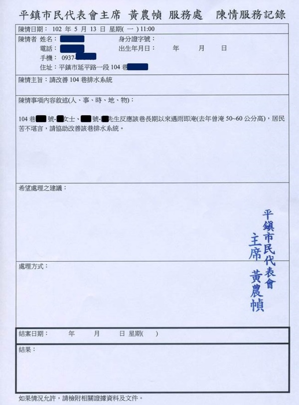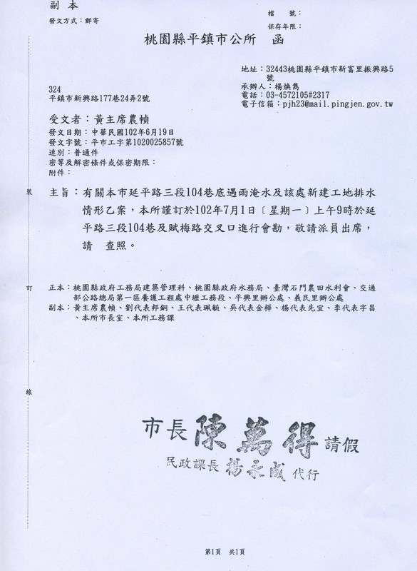 延平路三段104巷底遇雨即淹乙案,平鎮市公所訂於7月1日(星期一)上午9:00時,會同縣政府、台灣石門農田水利會及高工局中壢工務段人員於延平路三段104巷及賦梅路交叉口進行會勘。