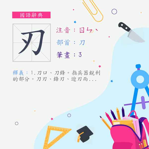 附帶一提:刃,指事字,原指刀鋒利之意,即用一點指在刀口上。所以,寫「刃」字時,最後一筆要點在刀口上,不能點在旁邊,或點進刀肉內,而且也不能寫成一捺。