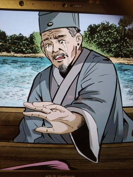 抵達金山時,他要上岸採買,吩咐家人不要在船上烤肉,以免水中黿怪聞香而來。家人不疑有它,竟在船上烤起肉來。(註:照片翻拍自https://www.youtube.com/watch?v=MOqG_HwNZVc)