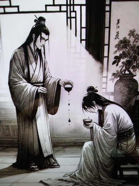 韋縣令聞言,又羞又愧,便心生一計,在酒摻了毒藥,毒死她。(註:照片翻拍自https://www.youtube.com/watch?v=NDxpmisxQjk)