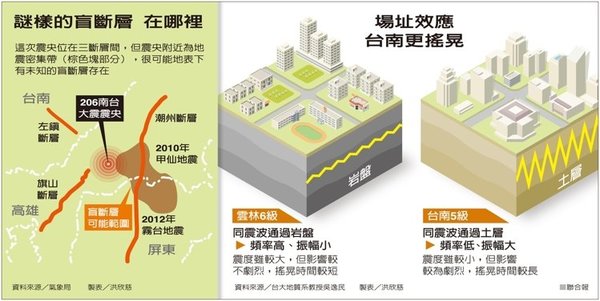 2016年2月6日凌晨3時57分27.2秒高雄市美濃區發生芮氏規模6.4強震,釀成台南市重大死傷,中央氣象局地震測報中心主任郭鎧紋指出震央位於左鎮斷層、旗山斷層與潮州斷層之間,這三條斷層都不活躍,根據過去累積的有感地震資料,反而是這三條斷層中間有一塊「地震密集帶」,昔年有感地震都集中於此,包括甲仙地震與霧台地震,可能是「盲斷層」(根據經濟部中央地質研究所定義,就是斷層面並未露出到地表的斷層;一般是指位於較深部的斷層,其前緣尚未破裂延伸到地表附近;或是斷層在地表附近受到深厚的沉積物覆蓋,在地表淺部未能發現其蹤跡,也稱為盲斷層。),根據經濟部中央地質調查所列管的斷層中,這個地震密集帶沒有斷層破裂到地表,所以很難判斷是否有斷層在這地方。台南因「場址效應」,因此受災比震央美濃更嚴重。過去震央附近的有感地震,最接近震央的地震是2010年3月4日的甲仙地震、當年規模6.42發、震度與這次美濃地震相當,其次是2012年2月26日屏東霧台地震、規模6.35。過去南台灣出現重大傷亡的大地震中,1946年的新化地震與這次美濃大地震最靠近;而1964年白河大地震與這次的震央距離遠,研判不是相同的斷層造成。這次初步研判可能就是密集帶的地震,而非目前所知斷層造成的地震。