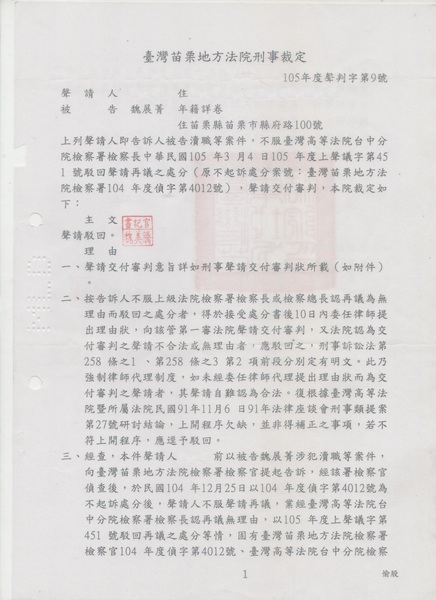 臺灣苗栗地方法院刑事105聲判字第9號