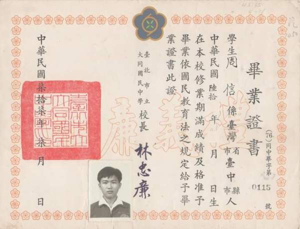 1985(74)年自光榮國民小學畢業後,就讀本校,當年是所知名的男校,1988(77)年畢業後高中.高職.五專聯考及建中補校慘敗落榜,於省立泰山高中補校招考入取汽修科,於下學期轉學至臺灣省立三重商工補校1990(80)畢業,臺灣省政府教育廳資格證明