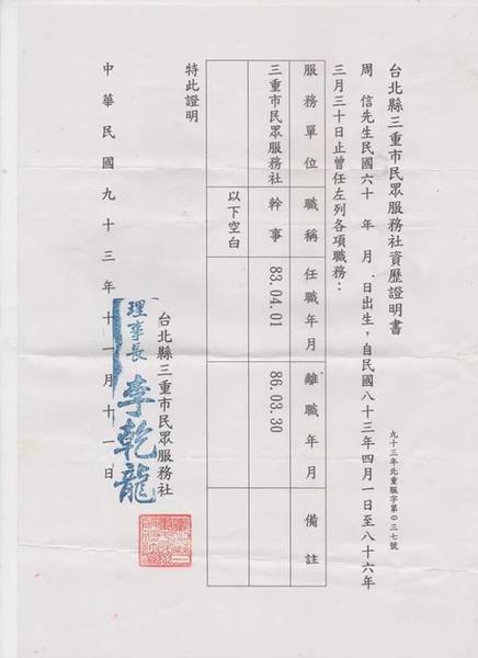 台北縣三重市民眾服務社代理專員1997(86)3.30