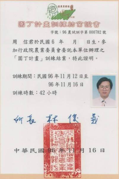 2007(96)11月12日至11月16日参加行政院農業委員會南投農業試驗所園丁計畫訓練結訓