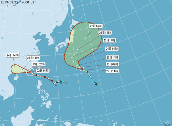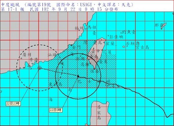 14時第22報解除颱風警報950百帕:北緯 22.4 度,東經 116.7 度, 即在金門的西南方約 290 公里之海面上。 7級風暴風半徑 200 公里,10級風暴風半徑 80 公里。以每小時19公里速度,向西進行。 近 中 心 最 大 風 速:每秒 40公尺(約每小時 144 公里),相當於 13 級風。 瞬 間 之 最 大 陣 風:每秒 50 公尺(約每小時 180 公里),相當於 15 級風。 預 測 時 間:23日14時。 預 測 位 置:北緯 23.0 度,東經 112.4 度, 即在香港的西北西方約 200 公里之處。 颱 風 動 態:根據最新資料顯示,第19號颱風過去3小時強度略為減弱、暴風半徑亦較縮小,目前中心在金門 南南西方海面,繼續向西移動,臺灣東半部、西南部地區及恆春半島降雨仍持續中。預計此颱風強 度有減弱且暴風圈有縮小的趨勢。 警 戒 區 域 及 事 項:*豪雨特報:19號颱風外圍環流影響,今(22)下午起花蓮、臺東地區及恆春半島有大雨或豪 雨,南部、宜蘭、基隆、大臺北地區及澎湖、金門有大雨發生的機率,連日降雨,請 注意坍方、落石、土石流。 *9月19日0時至22日14時出現較大累積雨量如下: 花蓮縣天祥785毫米、臺東縣向陽 754毫米、屏東縣大漢山718毫米、宜蘭縣古魯692毫米、 高雄市南天池553毫米、 新竹縣西丘斯山454毫米、桃園縣拉拉山436毫米、南投縣奧萬大328毫米、新北市福山 303毫米、臺中市梨山296毫米、臺北市舊莊270毫米。 出現較大陣風區域如下:蘭嶼 17級以上,恆春14級,東吉島、大武11級,梧棲、成功、新屋、澎湖、金門及彭佳嶼10 級。 *金門、澎湖及臺灣西南部沿海風浪仍大,並有長浪發生的機率,前往海邊活動請特別注意。 *適逢大潮期間,金門沿海低窪地區應防淹水及海水倒灌。