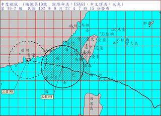 7時第19-2報945百帕:北緯 21.6 度,東經 118.0 度, 即在鵝鑾鼻的西方約 300 公里之海面上。 暴 風 半 徑:7級風暴風半徑 250 公里,10級風暴風半徑 100 公里。 以每小時19公里速度,向西北西進行。 近 中 心 最 大 風 速:每秒 43 公尺(約每小時 155 公里),相當於 14 級風。 瞬 間 之 最 大 陣 風:每秒 53 公尺(約每小時 191 公里),相當於 16 級風。 預 測 時 間:23日5時:北緯 22.4 度,東經 114.1 度,即在金門的西南西方約 490 公里之處。 颱 風 動 態:根據最新資料顯示,第19號颱風過去3小時強度略為減弱,目前中心在鵝鑾鼻西方海面,繼續向 西北西移動,暴風圈仍籠罩恆春半島、屏東、高雄、臺南及澎湖,各地風雨仍持續中。預計此颱風 強度有持續減弱且暴風圈有縮小的趨勢。 警 戒 區 域 及 事 項:陸上警戒:恆春半島、屏東、高雄、臺南及澎湖地區應嚴加戒備並防強風豪雨。 海上警戒:巴士海峽、臺灣海峽及東沙島海面航行及作業船隻應嚴加戒備。 降雨警戒:臺東、花蓮及宜蘭地區應嚴加戒備。 *豪雨特報:19號颱風影響,今(22)日臺東地區及恆春半島、宜蘭山區、花蓮山區、高屏山 區有大豪雨或超大豪雨,宜蘭、花蓮、南部地區、南投山區及臺中以北山區有局部豪 雨或大豪雨,北部地區有大雨或豪雨,中部地區及澎湖、金門有大雨發生的機率,請 注意防範坍方、落石、土石流及山洪爆發,低窪地區請慎防淹水。 超大豪雨:臺東縣、花蓮縣、宜蘭縣、屏東縣、高雄市。 大豪雨 :新北市、桃園縣、南投縣。 *9月19日0時至22日7時出現較大累積雨量如下: 花蓮縣豐南707毫米、 臺東縣向陽 699毫米、宜蘭縣古魯671毫米、屏東縣大漢山652毫米、新竹縣西丘斯山448毫米、 高雄市小關山444毫米、桃園縣拉拉山433毫米、 南投縣奧萬大322毫米、新北市福山 296毫米、臺中市梨山285毫米、臺北市舊莊256毫米。 出現較大陣風區域如下:蘭嶼 17級以上, 恆春14級, 東吉島、大武11級, 梧棲、成功、新屋、澎湖、金門及 彭佳嶼10級。 *臺灣各地區沿海風浪仍大,請民眾避免前往海邊活動,強陣風地區應防電力中斷。 *金門地區受颱風外圍環流影響,有10至11級強陣風出現的機率,請注意。 *適逢大潮期間,沿海低窪地區應防淹水及海水倒灌。 *若此颱風行徑無特殊變化,本局預計於今日8時30分解除陸上颱風警報。