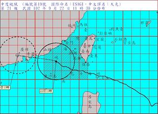 11時第21報:北緯 22.1 度,東經 117.4 度, 即在金門的南南西方約 280 公里之海面上。 以每小時19公里速度,向西進行。預 測 時 間:23日11時。 預 測 位 置:北緯 22.8 度,東經 113.0 度, 即在香港的西北西方約 130 公里之處。 颱 風 動 態:根據最新資料顯示,第19號颱風過去3小時半徑略為縮小,目前中心在金門南南西方海面,繼續 向西移動,臺灣東半部、西南部地區及恆春半島降雨仍持續中。預計此颱風強度有減弱且暴風圈有 縮小的趨勢。 警 戒 區 域 及 事 項:海上警戒:巴士海峽、臺灣海峽及東沙島海面航行及作業船隻應嚴加戒備。 降雨警戒:臺東、花蓮、恆春半島、屏東、高雄及宜蘭地區應嚴加戒備。 *豪雨特報:19號颱風影響,今(22)日臺東地區及恆春半島、宜蘭山區、花蓮山區、高屏山 區有大豪雨或超大豪雨,宜蘭、花蓮、南部地區、南投山區及臺中以北山區有局部豪 雨或大豪雨,北部地區有大雨或豪雨,中部地區及澎湖、金門有大雨發生的機率,請 注意防範坍方、落石、土石流及山洪爆發,低窪地區請慎防淹水。 超大豪雨:臺東縣、花蓮縣、宜蘭縣、屏東縣、高雄市。 大豪雨 :新北市、桃園縣、南投縣。 *9月19日0時至22日11時出現較大累積雨量如下: 花蓮縣天祥775毫米、臺東縣向陽 719毫米、宜蘭縣古魯691毫米、屏東縣大漢山700毫米、新竹縣西丘斯山453毫米、 高雄市南天池493毫米、桃園縣拉拉山436毫米、 南投縣奧萬大328毫米、新北市福山 303毫米、臺中市梨山294毫米、臺北市舊莊266毫米。 出現較大陣風區域如下:蘭嶼 17級以上, 恆春14級, 東吉島、大武11級, 梧棲、成功、新屋、澎湖、金門及 彭佳嶼10級。 *臺灣各地區沿海風浪仍大,請民眾避免前往海邊活動,強陣風地區應防電力中斷。 *金門地區受颱風外圍環流影響,有10至11級強陣風出現的機率,請注意。 *適逢大潮期間,沿海低窪地區應防淹水及海水倒灌。 *若此颱風行徑無特殊變化,本局預計於今(22)日14時30分解除颱風警報。