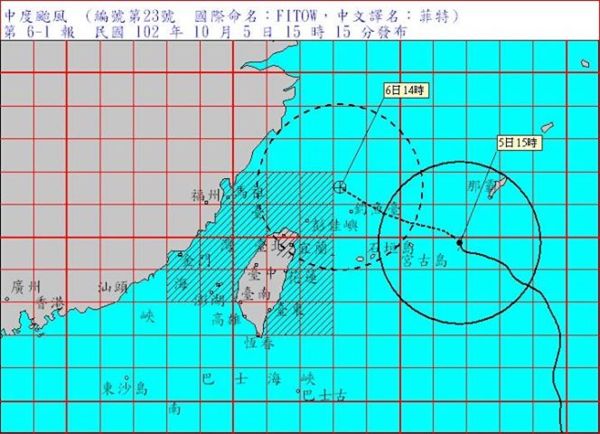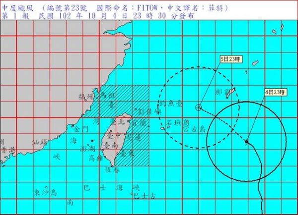 23時30分發怖海上颱風警報。第1報。中度颱風960百帕: 北緯 23.5 度,東經 128.9 度, 即在臺北的東南東方約 770 公里之海面上。 暴 風 半 徑:7級風暴風半徑 250 公里,10級風暴風半徑 80 公里。 預 測 速 度 及 方 向:以每小時14轉17公里速度,向西北轉西北西進行。 近 中 心 最 大 風 速:每秒 38 公尺(約每小時 137 公里),相當於 13 級風。 瞬 間 之 最 大 陣 風:每秒 48 公尺(約每小時 173 公里),相當於 15 級風。 預 測 時 間:5日23時。 預 測 位 置:北緯 25.6 度,東經 126.0 度, 即在臺北的東方約 460 公里之海面上。 颱 風 動 態:根據最新資料顯示,第23號颱風中心目前在臺北東南方海面,向西北轉西北西移動, 其暴風圈正逐漸向臺灣東部海面接近,對臺灣北部海面、東北部海面及東南部海面將構 成威脅。 警 戒 區 域 及 事 項:臺灣北部海面、東北部海面及東南部海面航行及作業船隻應嚴加戒備。 注 意 事 項:臺灣北部、東半部沿海地區及綠島、蘭嶼、恆春半島、東沙島有長浪出現,臺灣沿海地 區亦有較強陣風出現,前往海邊活動請特別注意