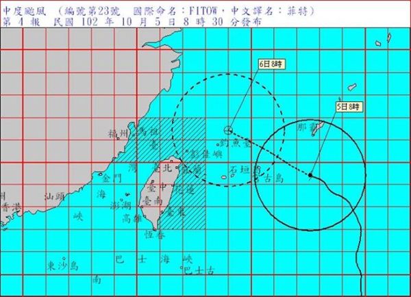 8時第4報:北緯 24.4 度,東經 127.6 度, 即在臺北的東方約 620 公里之海面上。 預 測 速 度 及 方 向:以每小時18公里速度,向西北西進行。 預 測 時 間:6日8時。 預 測 位 置:北緯 26.4 度,東經 124.0 度, 即在臺北的東北東方約 290 公里之海面上。 颱 風 動 態:根據最新資料顯示,第23號颱風中心目前在臺北東方海面,向西北西移動,其暴風圈 正逐漸向臺灣東部海面接近,對臺灣北部海面、東北部海面及東南部海面將構成威脅。 警 戒 區 域 及 事 項:臺灣北部海面、東北部海面及東南部海面航行及作業船隻應嚴加戒備。 *豪雨特報:颱風外圍環流影響,今(5)日北部地區有豪雨或大豪雨,東北部地區及 中部山區有大雨或豪雨發生的機率,請注意。 大豪雨:臺北市、新北市 *臺灣北部、東半部沿海地區及綠島、蘭嶼、恆春半島、東沙島有長浪出現,臺灣沿海 地區亦有較強陣風出現,前往海邊活動請特別注意。