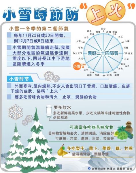 氣候寒冷,在中國北方,逐漸降雪。此時台灣北部地區二期稻仍然收割當中,南部地區因氣候暖和,一期稻作可進行播種育苗,冬季裏作雜糧作物此時也可栽培,台灣唯有高山地區才有降雪的可能。