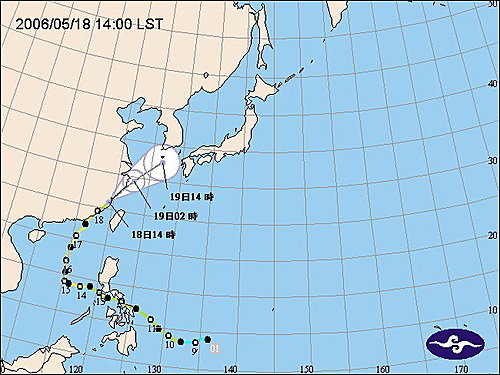 05時第5報北緯 19.9 度,東經 115.4 度,即在金門的南南西方約 590 公里之海面上。向北北東進行。預測18日5時。北緯 23.5 度,東經 117.0 度,即在金門的西南方約 180 公里之海面上。根據最新氣象資料顯示,颱風中心目前在東沙島西南西方海面,向北北東移動,其暴風圈逐漸進入台灣海峽南部,對金門及澎湖陸地構成威脅。陸上:金門及澎湖應嚴加戒備並防強風豪雨。海上:台灣海峽、東沙島海面及巴士海峽航行及作業船隻應嚴加戒備。過去9小時強度不變