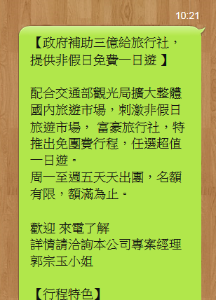 近期LINE瘋傳「政府補助3億給旅行社,提供非假日免費一日遊」訊息,真有那麼好康?