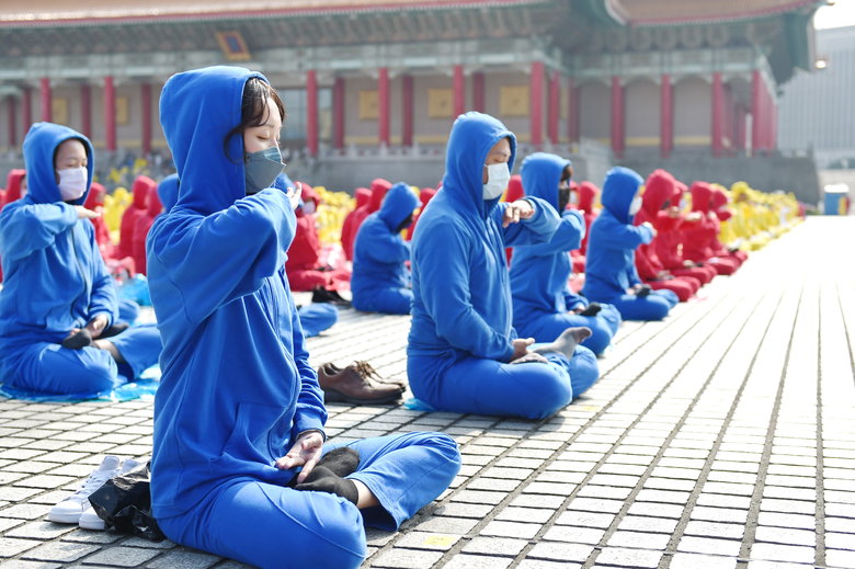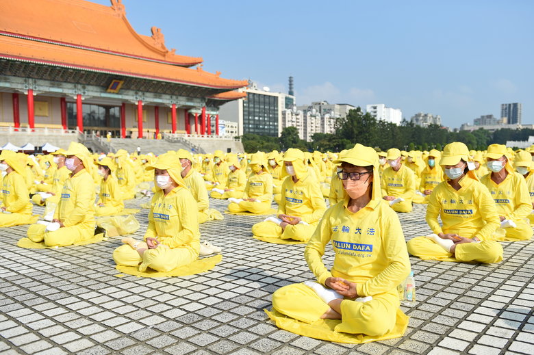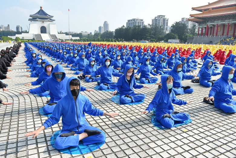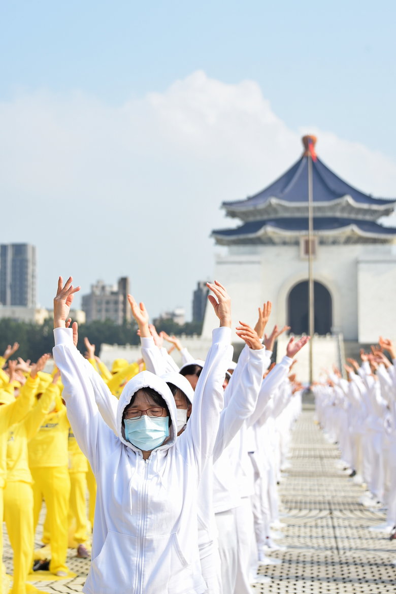 2022年11月12日,臺灣部分法輪功學員約五千人,齊聚在中正紀念堂的自由廣場演煉五套功法(大紀元)
