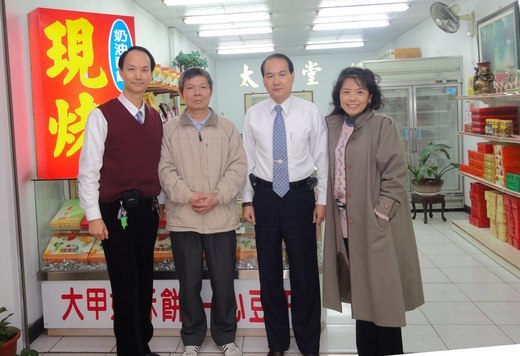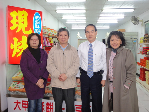 100年元旦,我和慧智、阿罡展開了台中一日行,下中港路,沿街的太陽餅店,我們在其中一家總店,與政二劉台柱相見歡,我們無所不聊,劉大嫂賢淑端莊,還為我們準備了伴手禮;台柱歡迎各路同學路過時來奉茶(茶葉茶具備妥等候),並祝兔年行大運 闔府安康 心想事成。
