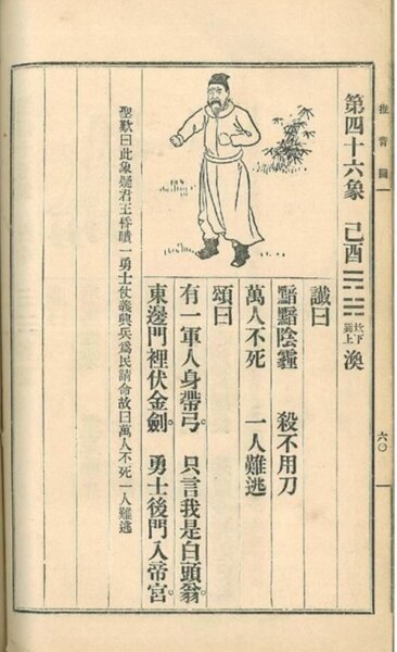 推背圖46象:[2025 乙巳年事件 有多個人主配的名字。確定證實!] 有一軍人身帶弓(張又俠)。。勇士(俠客)後門入帝宮(北京政變)。 東(卯辰)邊門裡伏手(金)劍(刀立)[劉振立]。。只言我是白頭翁(公習白頭-極度憂鬱)。。指大約在 張又俠+劉振立 對習近平 北京政變失敗的時間點:中共崩潰之前兆! 註釋:易經 [風水]渙卦:表渙散之象。主凶象。心神不寧、精神不佳,人事向心力均已離散,有頹廢不振的運勢。事業、感情、婚姻根基開始有鬆動的情勢產生。人的心緒、沈悶是最大的影響。
