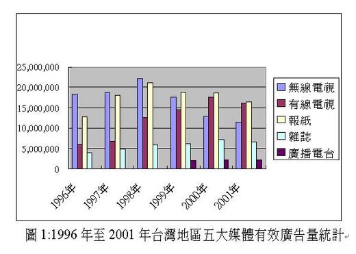 表1:1996年至2001年台灣地區五大媒體有效廣告量