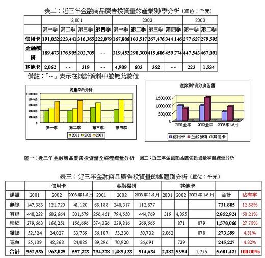 另一方面,若針對 2001 年至 2003 年 1-6 月前 10 大金融商品廣告投資量進行分析,不難發現,現金卡、信用卡、小額信貸仍是金融商品廣告投放的主力商品,依據近三年的排名,可以看出不少指標銀行藉由大量廣告,行銷金融商品的企圖心,例如中國信託、萬泰、台新、誠泰、匯豐、聯邦、大眾、花旗等;其中值得一提的是台北銀行,台北銀行因為承攬公益彩券業務,在廣告投資上連續兩年投入不少成本;此外,比較特殊的是萬事達卡,為了推廣,亦在廣告上投下不少本錢。從整體廣告投資市場來看,每年廣告投資前 10 大金融商品,皆可視為市場的指標商品,上下排名的起伏,反映金融商品市場的類別商品的走向與趨勢,值得廣告商與廣告代理商重視。