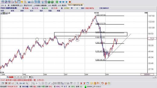 各位看官,按照往例,小弟仍是利用週k線來講解。前幾週國際油價都到七十出頭關卡價就回檔,是有其因的。由上圖油價週k線來看,觀察油價從147修正至33.6,一半的位置就在73左右;而2006年那一波如教科書範本的走勢,該頸線價位70位置(那五個圈圈價位),也近此價,所以到了70-73此價位,便有一界天險,無法超越,很神奇吧!技術分析就是這麼微妙。