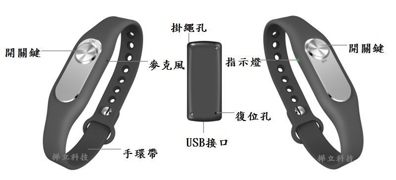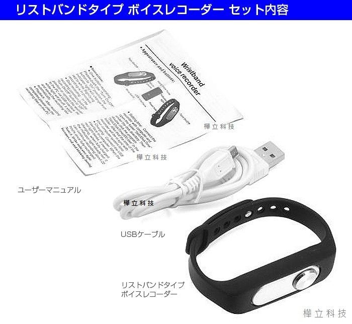 (1).錄音筆 ✕1 (內建鋰電池) (2).手環 (黑色)✕1 (3).傳輸線 ✕1 (4)包裝盒 中英文說明書✕1 贈:充電器✕1