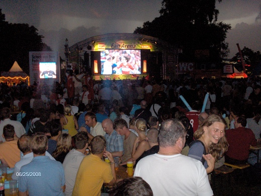 利用休兵期間,到克羅地亞遊山玩水,回來路上耽擱了行程,急匆匆趕到大銀幕時,已不準入場,大銀幕外場也擠滿人,擠進人潮中找到落腳處,周遭幾乎全是奧地利及土耳其人,兩國都在此次歐洲杯輸給德國,他們轉而支持西班牙,再者,頗有實力的西班牙,自1964年贏得歐洲國家杯冠軍之後,長達44年與世界盃及歐洲國家杯冠軍絕緣,而德國獲世界盃及歐洲杯冠軍寶座次數大約有5-6次,其成績著實令人稱羨慕,西班牙今日能有如此機運,支持者發揮其同情心似乎必然了。