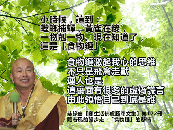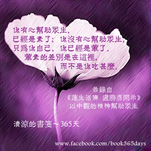 你有心幫助眾生,已經是素了; 你沒有心幫助眾生,只為你自己, 你已經是葷了。 葷素的差別是在這裡, 而不是你吃甚麼。 恭錄自《蓮生活佛 盧勝彥開示》 以中觀的精神幫助眾生 【蓮生活佛盧勝彥著作】 — ...
