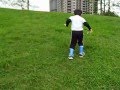 腦性痲庳物理復健--台中文心公園-(練腿力..練肌力) -元元走上草皮斜坡復健