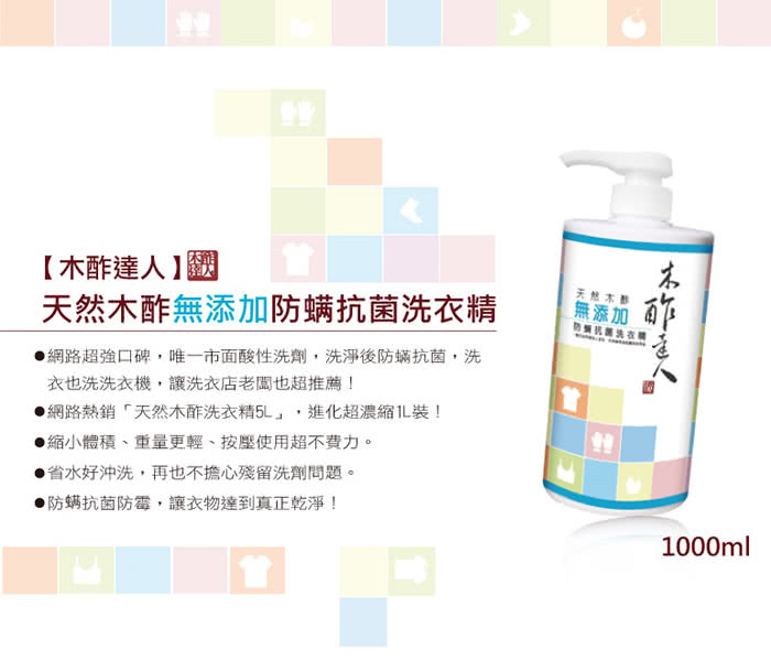 分享給你一款【木酢達人】天然木酢無添加超6倍濃縮防蹣抗菌洗衣精補充罐(1000ml)洗衣服是一項細活,衣服的清潔度代表著我們的個人形象,全面清洗衣物,需要搭配一款好的洗衣粉。無磷配方更舒適,速溶易漂,深層去除衣物上的污漬,把白衣洗得亮白,彩衣洗得鮮艷,讓你每天都光彩照人。