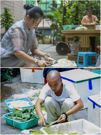 林穗来夫妇每天到后厨择菜洗菜,亲力亲为(图片来源:东林寺)