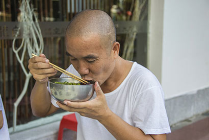 每天清晨,林穗来最喜欢坐在店门边的临时办公桌前,和员工讨论工作,或者就着最简单的素菜喝一碗稀粥,他说:从没想到幸福能如此简单。(图片来源:东林寺)