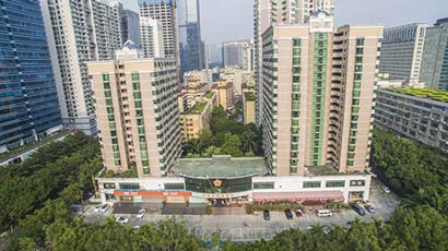 航拍到的新梅园圆通素食深圳车公庙店门头,经营海鲜时的总店,曾经日进斗金。(图片来源:东林寺)