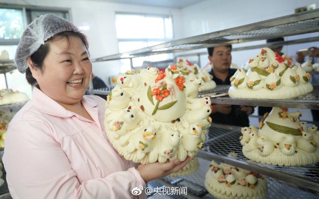 山東威海文登區46歲的林紅,每天在小屋裡圍著饅頭大作「文章」,短短三年時間,她的「花餑餑」就銷售到中國各地,年銷售額超過1000萬人民幣(約152萬美元)。她說,「我們這麼好的餑餑,就應該把它做成我們自己中式的生日蛋糕」