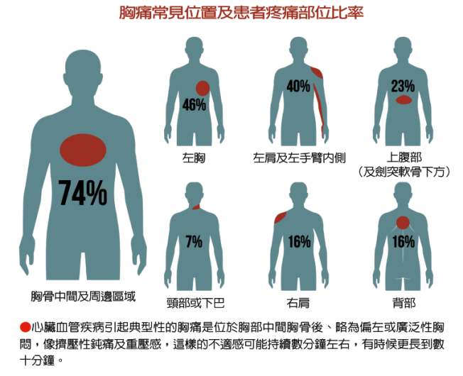 要回答這個問題之前,要先了解什麼是胸痛。只要是頸部以下及上腹部以上的區域感到不適或疼痛,都稱為胸痛。在這範圍內的皮膚、肌肉、骨骼、筋膜、器官所引起的不適都會造成胸痛,但若這樣的症狀持續數分鐘之久,同時有呼吸困難、呼吸急促、冒冷汗、心悸、頭暈、暈厥等,甚至會有左手臂、左肩、下巴、頸部及牙齦這些部位的「反射痛」時(右圖),則很有可能是心臟病所引起。