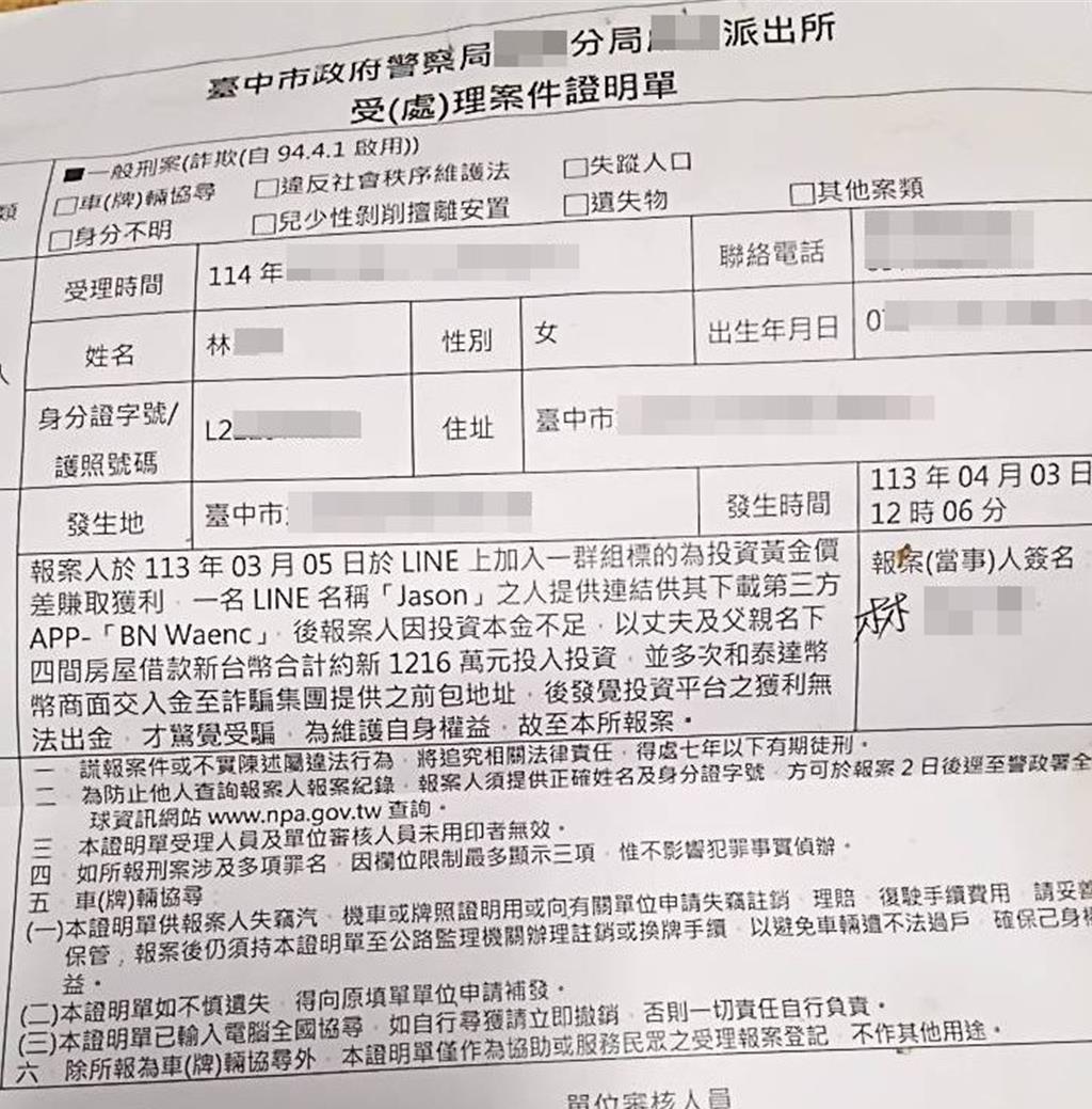據林婦提供的匯款資料以及交付單據,她已投入1216萬元到黃金投資案,今年要求出金,對方先是稱帳戶遭凍結需要再補存數萬元解凍,最後竟人間蒸發,父女倆才發現受騙,但先前借款並抵押4間房,讓兩人背上3500萬元債務。為清償債務,林父賣掉2間房子獲得1900萬元抵債,每月仍得支付30萬元利息。霧峰警分局證實今年4月已接獲林姓婦人報案,目前仍在積極偵辦中。